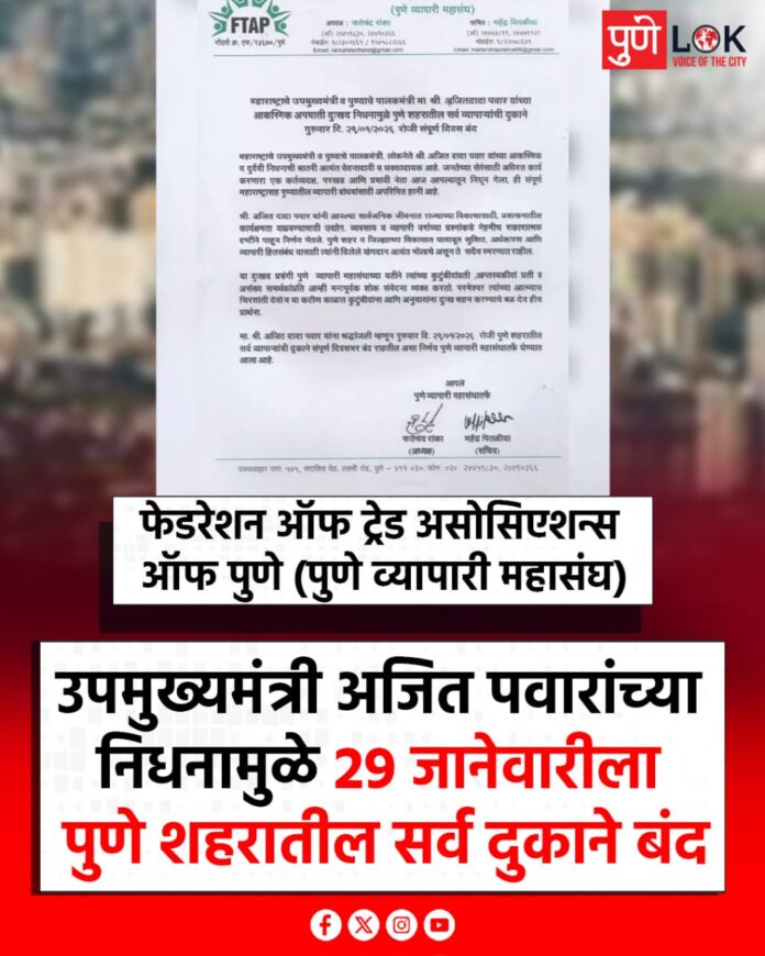 ताज्या बातम्या उपमुख्यमंत्री अजित पवार यांच्या निधनामुळे 29 जानेवारी रोजी पुणे शहरातील सर्व दुकाने बंद ठेवण्याचा निर्णय व्यापारी महासंघाने घेतला. By Pune Lok - 28 January 2026 2 32 FacebookTwitterPinterestWhatsApp