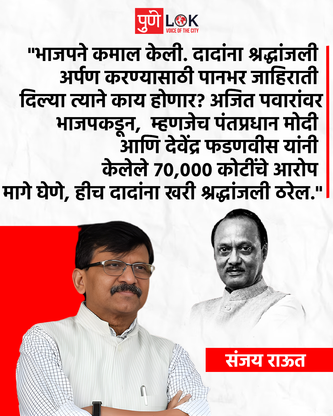 ताज्या बातम्या भाजपने कमाल केली. By Pune Lok - 29 January 2026 0 24 FacebookTwitterPinterestWhatsApp दादांना श्रद्धांजली अर्पण करण्यासाठी पानभर जाहिराती दिल्या त्याने काय होणार? अजित पवारांवर भाजपकडून, म्हणजेच पंतप्रधान मोदी आणि देवेंद्र फडणवीस यांनी केलेले ७०,००० कोटींचे आरोप मागे घेणे, हीच दादांना खरी श्रद्धांजली ठरेल