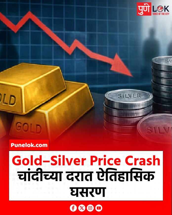 सोने आणि चांदीच्या दरात मोठी घसरण पाहायला मिळत आहे. आंतरराष्ट्रीय बाजारातील घडामोडी, डॉलरमधील चढउतार आणि मागणीत झालेली घट यामुळे सोन्या-चांदीच्या किमतींमध्ये ऐतिहासिक घसरण नोंदवली गेली आहे.