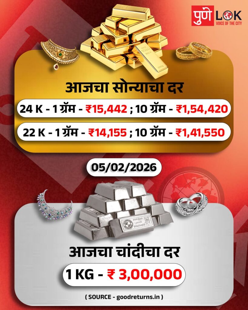 ताज्या बातम्या 05 फेब्रुवारी 2026 | पुणे By Pune Lok - 5 February 2026 0 17 FacebookTwitterPinterestWhatsApp ✨ आजचा सोन्या-चांदीचा दर ✨💛 सोनं (Gold Rate Today)🔸 24K – 1 ग्रॅम : ₹15,442🔸 24K – 10 ग्रॅम : ₹1,54,420🔸 22K – 1 ग्रॅम : ₹14,155🔸 22K – 10 ग्रॅम : ₹1,41,550🤍 चांदी (Silver Rate Today)🔸 1 ग्रॅम : ₹300🔸 1 किलो : ₹3,00,000