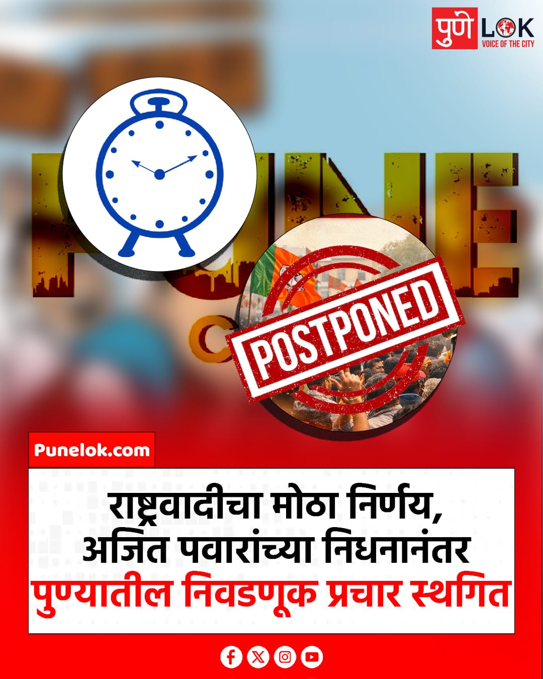 पुण्यात सुरू असलेला निवडणूक प्रचार तात्पुरता स्थगित करण्याचा निर्णय जाहीर करण्यात आला आहे. शोक व्यक्त करण्यासाठी आणि कार्यकर्त्यांच्या भावना लक्षात घेऊन हा निर्णय घेण्यात आल्याचे पक्षाकडून सांगण्यात आले आहे. या निर्णयामुळे पुण्यातील राजकीय हालचालींना तात्पुरता विराम मिळाला आहे. ⏸️🕯️🏛️