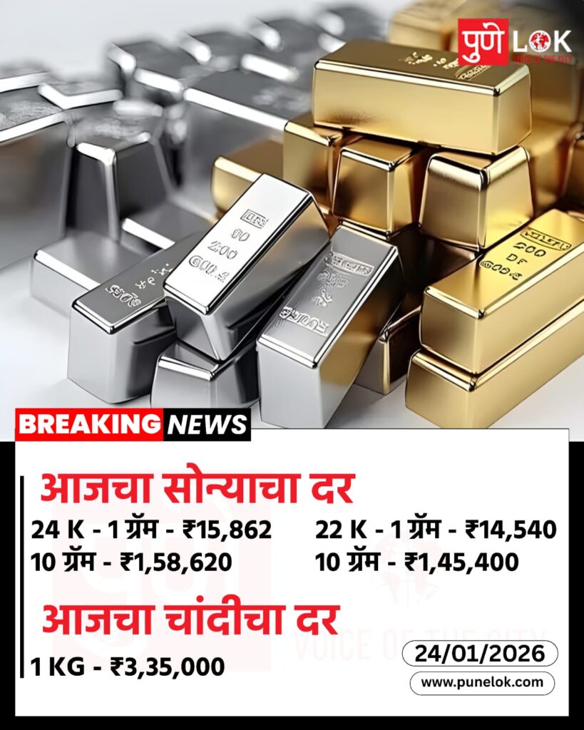 Blog ЁЯФ┤Pune рдЖрдЬрдЪрд╛ рд╕реЛрдиреНрдпрд╛рдЪрд╛ рджрд░ тЬия╕ПтЬия╕П By Pune Lok - 24 January 2026 0 14 FacebookTwitterPinterestWhatsApp 24 K – 1 рдЧреНрд░реЕрдо – тВ╣15,86210 рдЧреНрд░реЕрдо – тВ╣1,58,62022 K – 1 рдЧреНрд░реЕрдо – тВ╣14,54010 рдЧреНрд░реЕрдо – тВ╣1,45,400 рдЖрдЬрдЪрд╛ рдЪрд╛рдВрджреАрдЪрд╛ рджрд░тнРя╕П1 KG – тВ╣3,35,000