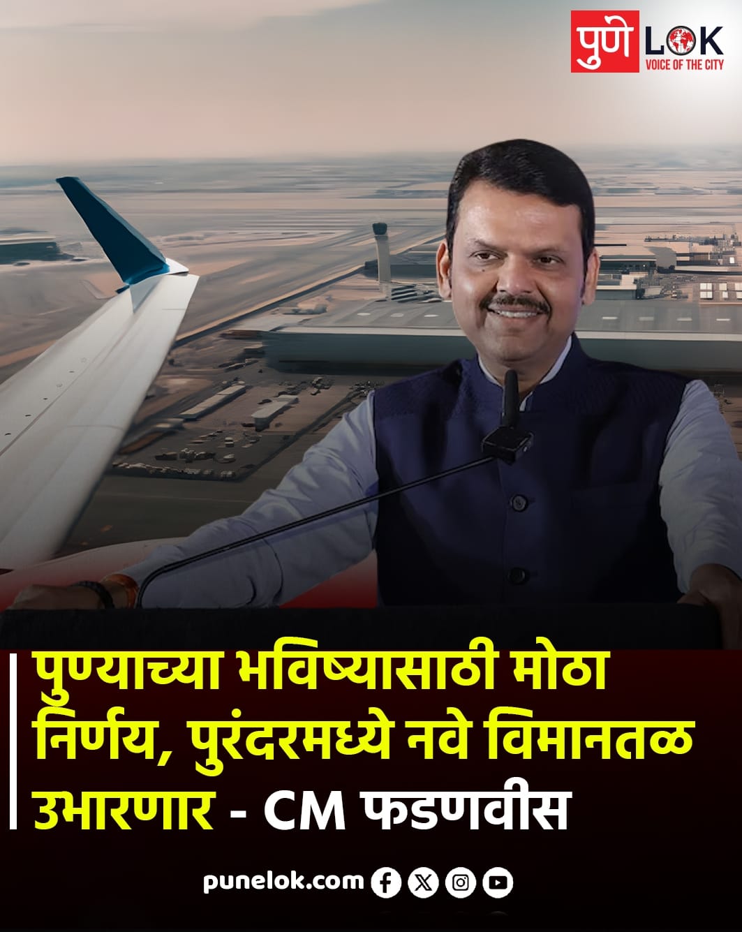 Blog पुण्याच्या भविष्यासाठी ऐतिहासिक पाऊल ✈️पुरंदरमध्ये नवे विमानतळ उभारण्याचा मोठा निर्णय! By Pune Lok - 4 February 2026 0 15 FacebookTwitterPinterestWhatsApp मुख्यमंत्री देवेंद्र फडणवीस यांची घोषणा — पुण्याच्या विकासाला नवी गती 🚀